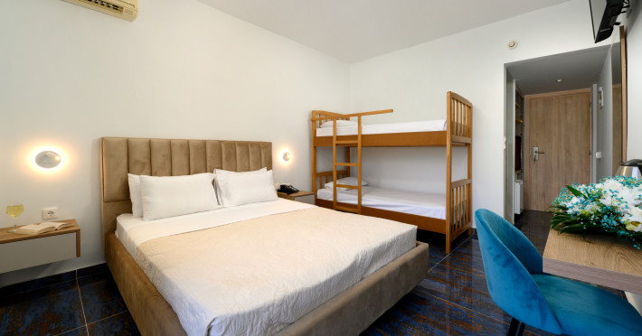 The Accommodations at this hotel are designed to welcome you and your family in comfort, luxury and style. For one, two children or adults of any age, the hotel offers double rooms, superior rooms, two-bedroom family rooms and junior suites.The rooms are distributed between a main building and 4 bungalows, spread over 46 hectares. All rooms are equipped with a balcony, veranda, bathroom, air-conditioning, satellite TV, mini-fridge,Kettle set, safe deposit box, bath amenities, hair dryer, telephone. It is the ideal choice families, groups and couples for a relaxing holiday.