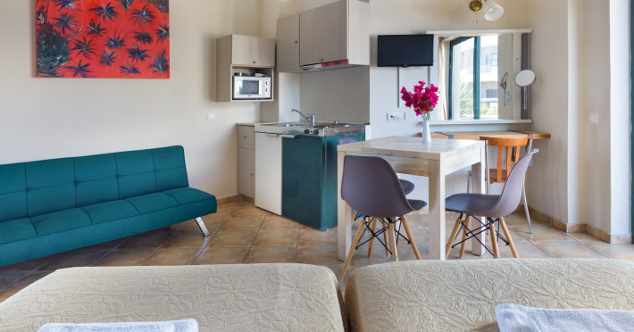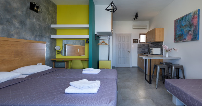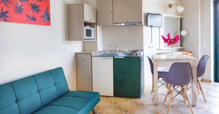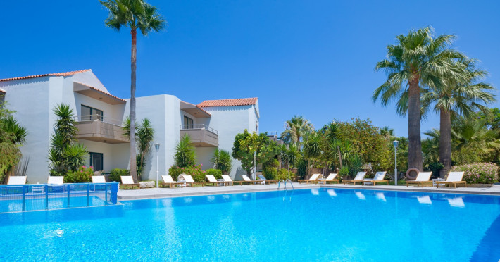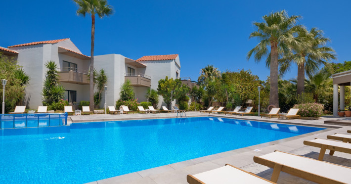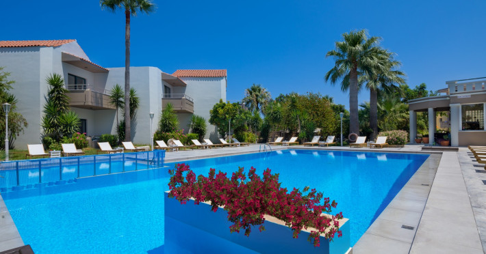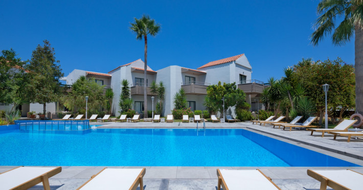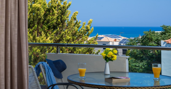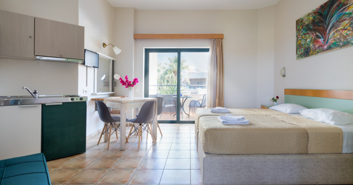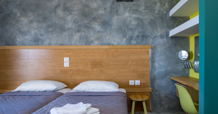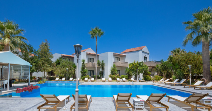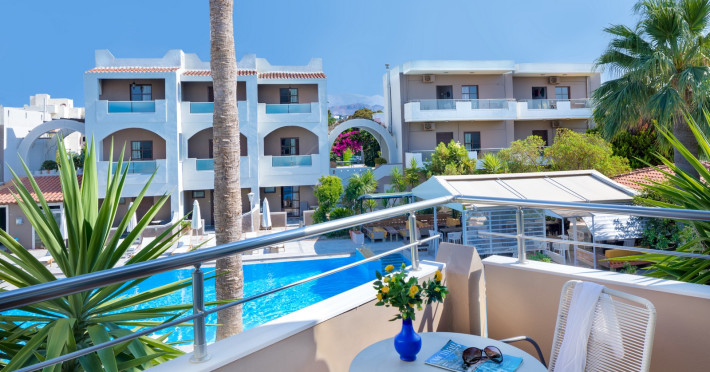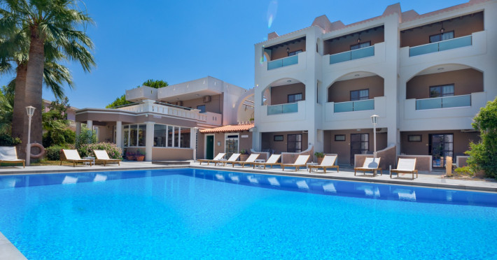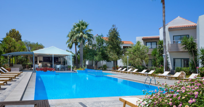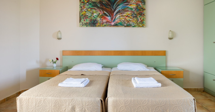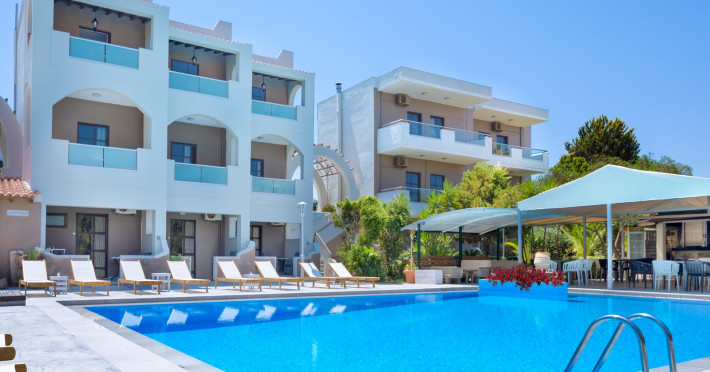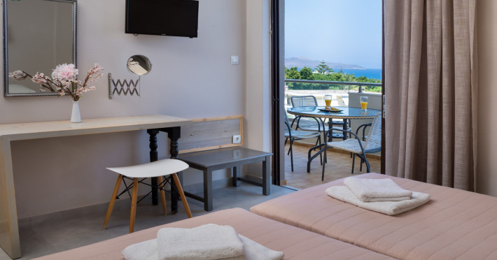 The Hotel facilities include: Reception, two swimming-pools (one children’s pool), Pool- Bar, with ability of serving full meals, free wi-fi in the pool bar and the reception area, tennis- court, table-tennis, spacious surroundings, gardens, parking and double private access to main roads.The rooms are built in three levels either-side of the swimming pools and look over the pool, the bar and the green surroundings. Most of the rooms also have sea view , straight to the islet of Agioi Apostoloi, the small island of Thororou northside, and the village of Daratso from south, with the background of White Mountains roots.