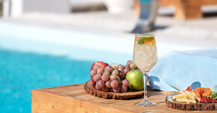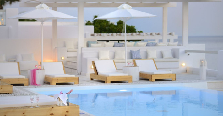 The 5 star Nissaki Boutique Hotel's Pool Bar is the ideal Mykonos spot for enjoying a cup of coffee, a drink or a delicious fresh fruit cocktail by the pool.The elegantly designed Nissaki Pool Bar creates a serene atmosphere, blending harmoniously with the Mykonos nature. Discover the true beauty of Mykonos in Cyclades, Greece with this breathtaking 5 star boutique hotel in Mykonos and enjoy genuine luxurious holidays.