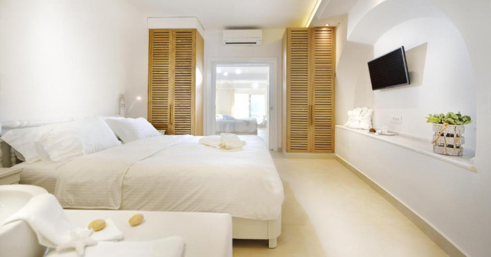 Camerele de la Nissaki Boutique sunt dotate cu aer condiționat, Tv cu canale prin satelit și seif. Un minibar și o mașină pentru preparare cafea sau ceai se află în fiecare cameră. Oaspeții pot solicita serviciul de room service pentru a servi masa sau diverse băuturi. Oaspeții au acces gratuit la serviciul Wi-fi în camere. În camere există baie cu cadă sau duș, foehn, articole de toaletă gratuite, precum și halate de baie și papuci. Camerele au balcon cu vedere la mare sau la piscină. Curățenia in cameră se face zilnic. Există camere care au zonă de relaxare cu canapea, ceea ce asigură un plus de confort și răsfăț. Proprietatea oferă camere pentru familie cu o suprafață mai mare și un număr mai mare de paturi față de cele standard.