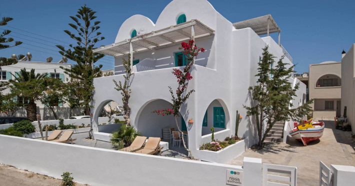 Amplasată în Santorini, Nissia Apartaments este o proprietate de 3 stele care oferă plajă privată și piscină exterioară cu șezlonguri și umbrele de soare. Proprietatea are servicii de închirieri auto. Se oferă acces gratuit la internet Wi-fi în spațiile publice. Parcarea este posibilă pe stradă, în imediata apropiere a proprietății.
