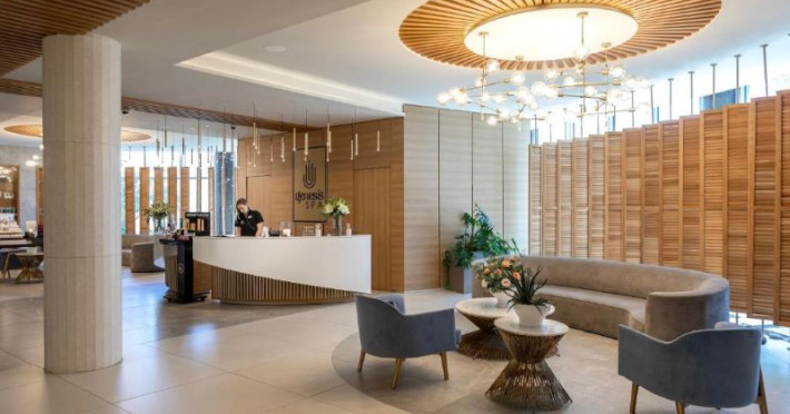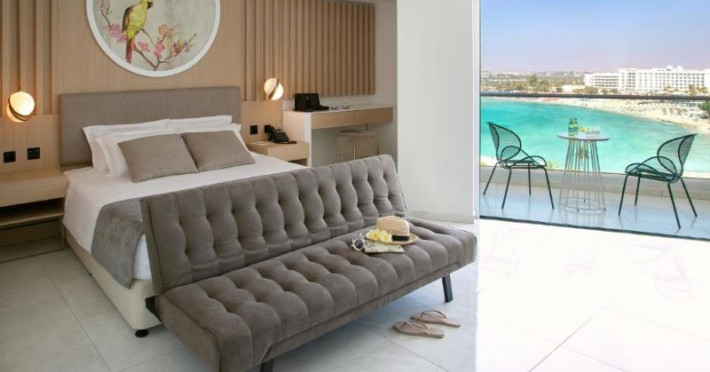 Hotelul Nissi Blue se află amplasat pe cea mai faimoasă plajă din Ayia Napa, Nissi Beach, cunoscută pentru nisipurile sale fine și albe și pentru apele limpezi și cristaline. Acesta se integrează perfect într-un decor natural de excepție, fiind înconjurat de grădini tropicale luxuriante. Cu o atenție deosebită la detalii și o arhitectură rafinată, hotelul oferă unități de cazare de lux, premiate cu 5 stele, pentru a asigura o experiență de neuitat oaspeților săi.Descriere hotel