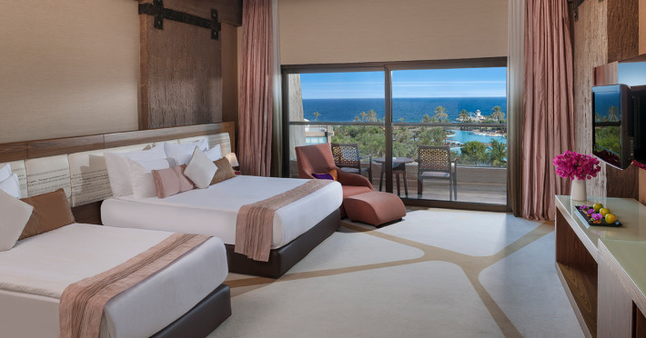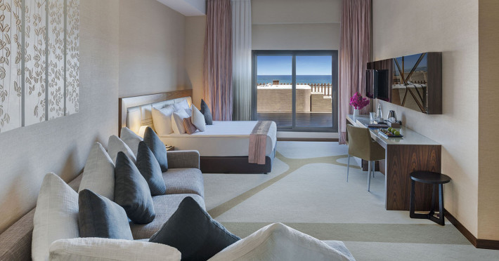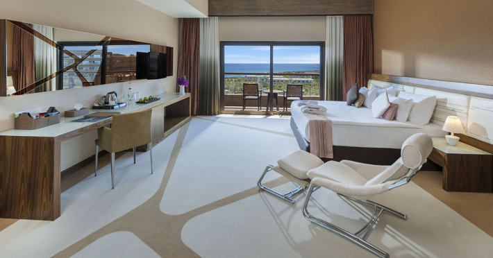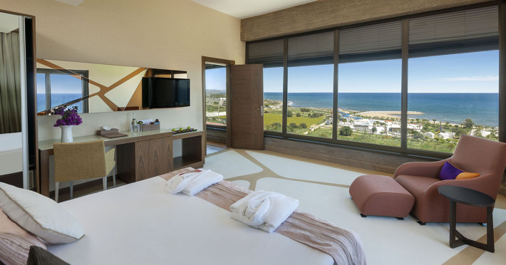 Camerele de la Noah`s Ark Deluxe sunt dotate cu aer condiționat, Tv cu canale prin satelit și seif. Fiecare cameră dispune de un aparat pentru preparare cafea sau ceai, cană-fierbător și minibar. Oaspeții pot solicita serviciul de room service pentru a servi masa sau diverse băuturi. Oaspeții au acces gratuit la serviciul Wi-fi în camere. În camere există baie cu cadă sau duș ce are în dotare foehn și articole de toaletă gratuite. Camerele au balcon cu vedere la mare sau la piscină. Curățenia in cameră se face zilnic.
