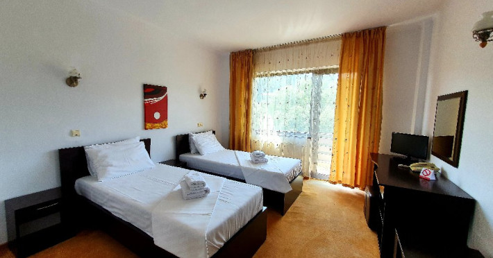 Camera dubla twin - doua paturi single, suprafata de 23 mp, baie cu dus, birou, minibar, internet wifi, halat de baie, papuci, tv si telefon.
