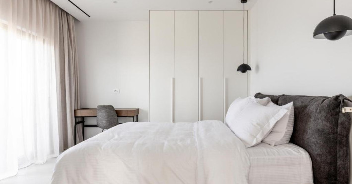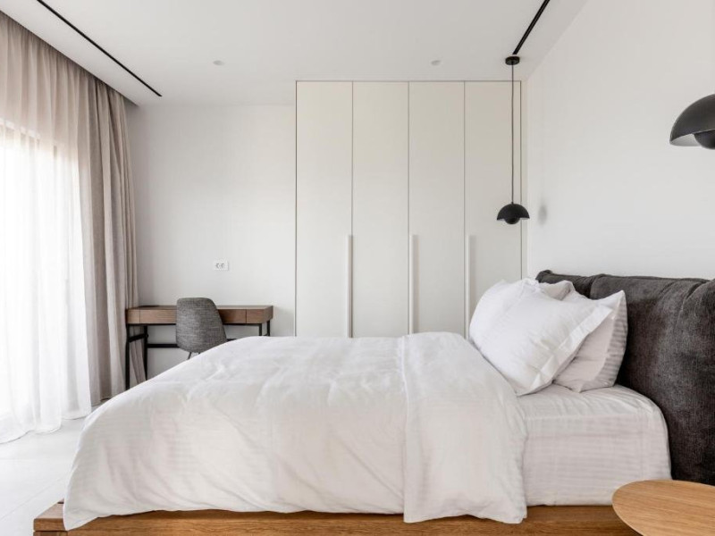 Dotari camere: Vilele sunt amenajate cu materiale de calitate si mobilier modern, reflectand un stil minimalist, dar sofisticat. Vila cu trei dormitoare include living spatios cu semineu, zona de dining pentru opt persoane, bucatarie complet utilata cu blat de marmura, trei dormitoare cu paturi king-size si bai proprii, balcone private cu vedere la mare si un spatiu de lucru in camera matrimoniala. Vilele cu doua dormitoare ofera aceleasi facilitati esentiale chicineta complet utilata, camere elegante cu baie proprie si zone de relaxare confortabile intr-un format compact si intim. Toate unitatile dispun de aer conditionat, seif, TV satelit, internet Wi-Fi si facilitati de spalatorie.