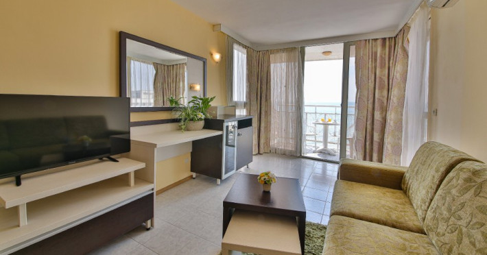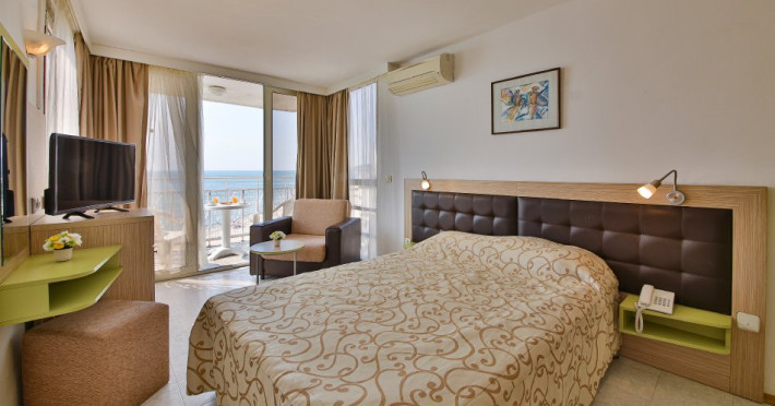 Hotelul oferă posibilitatea de cazare în camere duble și apartamente, toate dotate cu aer condiționat, birou cu scaun, telefon, TV prin cablu, baie cu duș sau cadă și uscător de păr și balcon cu scaune și masă cu vedere la mare sau la parc. Hotelul are, de asemenea, camere cu uși interconectate sau cu paturi supraetajate pentru familiile cu copii. Pătuțul penru copii se oferă gratuit, la cerere.