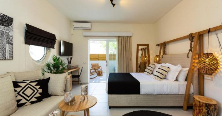 Nostos Beach Boutique Hotel este situat în Bali, un mic sat de pe litoral cu o atmosferă luminoasă și relaxantă.