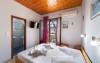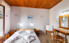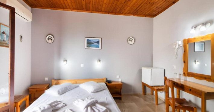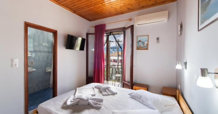 Hotelul Nostos oferă camere cu balcon mobilat, cu vedere la Marea Ionică și Insulele Prigiponisia. Camerele dispun de aer condiționat, TV și mini-frigider, baie privată, uscător de păr, balcon.