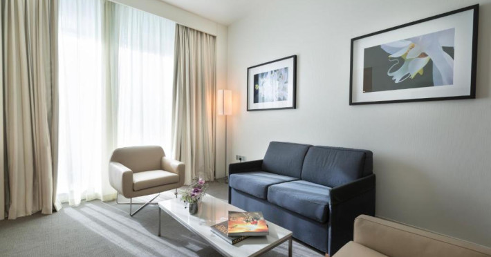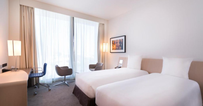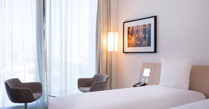 Camerele luminoase de la Novotel Abu Dhabi Al Bustan sunt dotate cu mochetă, aer condiționat, Tv cu canale prin satelit și seif. Fiecare cameră dispune de un aparat pentru preparare cafea sau ceai, cană-fierbător și minibar. Oaspeții pot solicita serviciul de room service pentru a servi masa sau diverse băuturi. Oaspeții au acces gratuit la serviciul Wi-fi în camere. Unele camere au balcon cu vedere la piscină. În camere există baie cu cadă sau duș ce are în dotare foehn și articole de toaletă gratuite. Curățenia in cameră se face zilnic. Proprietatea oferă camere pentru familie cu o suprafață mai mare și un număr mai mare de paturi față de cele standard.