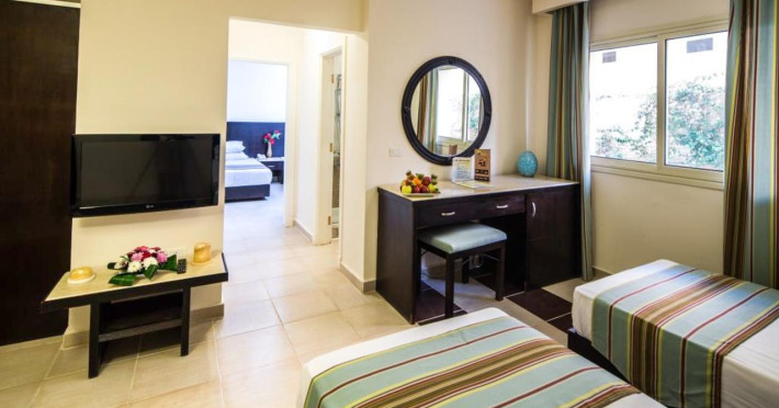 Sunt disponibile 456 camere. Camerele confortabile de la Nubia Aqua Beach Resort sunt dotate cu pardoseală de gresie/ marmură, aer condiționat, Tv și seif. Fiecare cameră dispune de un aparat pentru preparare cafea sau ceai. Oaspeții pot solicita serviciul de room service pentru a servi masa sau diverse băuturi. Unele camere au balcon cu vedere la mare sau la piscină. În camere există baie cu cadă sau duș prevăzută cu foehn. Curățenia in cameră se face zilnic. Proprietatea oferă camere pentru familie cu o suprafață mai mare și un număr mai mare de paturi față de cele standard. Se pot rezerva de asemenea camere pentru nefumători.