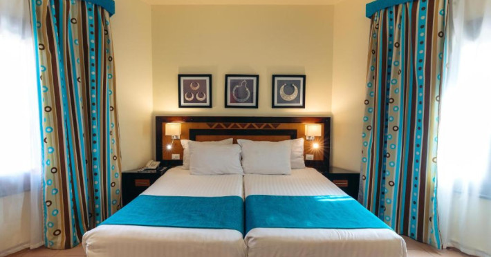 Sunt disponibile 292 camere. Unele camere au balcon cu vedere la grădină sau la piscină. Fiecare cameră dispune de minibar. În camere există baie cu cadă sau duș ce are în dotare foehn și articole de toaletă gratuite. Camerele confortabile de la Nubian Village au pardoseală de gresie/ marmură, aer condiționat, Tv cu canale prin satelit și seif. Oaspeții au acces la serviciul Wi-fi în camere contra cost. Curățenia in cameră se face zilnic. Proprietatea oferă camere pentru familie cu o suprafață mai mare și un număr mai mare de paturi față de cele standard.
