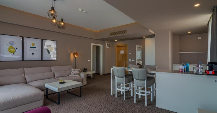 Apartamentele au vedere la mare sau la Lacul Siutghiol. Acestea sunt compuse din living cu canapea extensibila si dormitor cu pat matrimonial si o baie. In living exista o zona de bar si chicineta. In acest tip de camere se pot caza maxim 4 persoane dar nu mai mult de 3 adulti. Suprafata camerei este de 65 mp. Nu sunt disponibile paturi suplimentare.