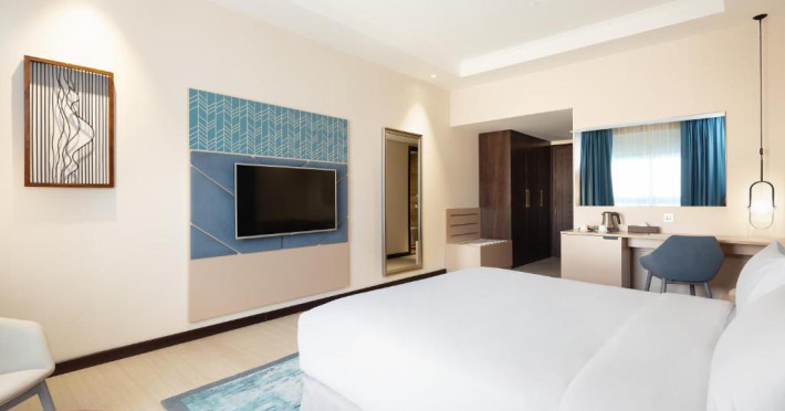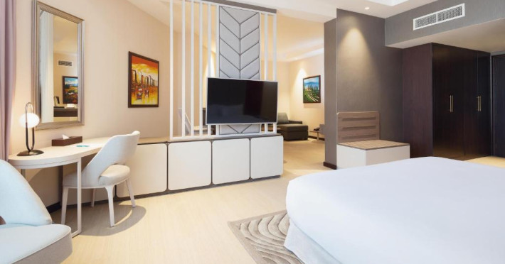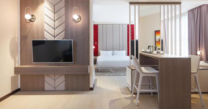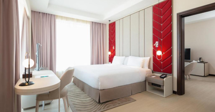 Camerele spațioase imbină designul contemporan cu elementele de confort premium, oferind oaspeților o atmosferă relaxantă și rafinată. Facilitățile hotelului includ o piscină infinity cu vedere panoramică asupra orașului, un centru spa modern, sală de fitness complet echipată și multiple opțiuni gastronomice in restaurantele proprii.