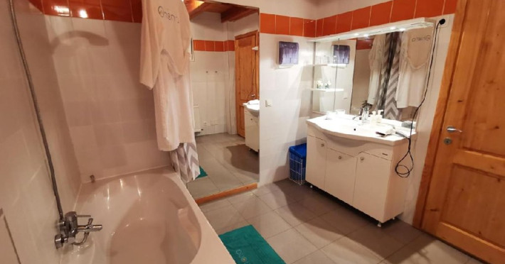 Fiecare dormitor are baie proprie cu cada, si una din camere are iesire privata la jacuzzi / ciubar cu hidromasaj si vedere la munte.