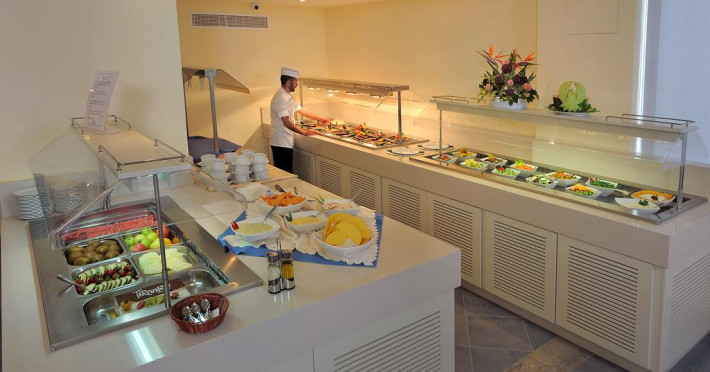La Okeanos Beach oaspeții au la dispoziție un restaurant care servește mâncare în stil bufet și à la carte. Preparate din bucătăria internațională, italiană, precum și preparate pescărești așteaptă să fie degustate în fiecare zi la micul dejun, prânz și cină. Masa poate fi servită atât în interior, cît si în aer liber, pe terasă, în funcție de vreme. Oaspeţii pot avea diverse băuturi răcoritoare sau alcoolice la bar. De asemenea , în cadrul proprietății, există cafenea și snack bar ideale pentru o gustare rapidă. Pentru cei cu anumite nevoi de nutriție, Okeanos Beach oferă meniuri pentru diete speciale.