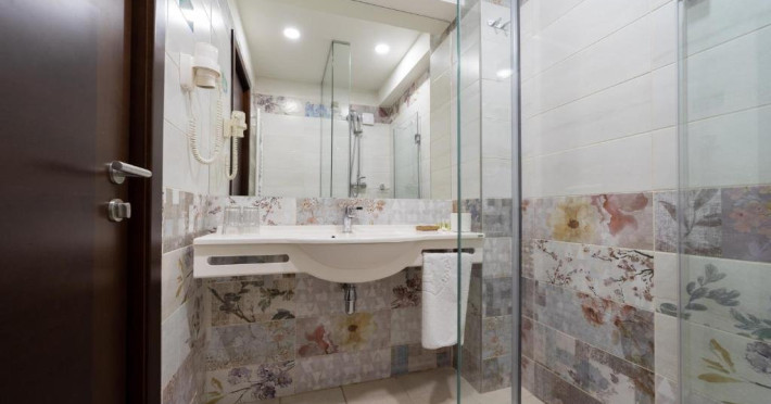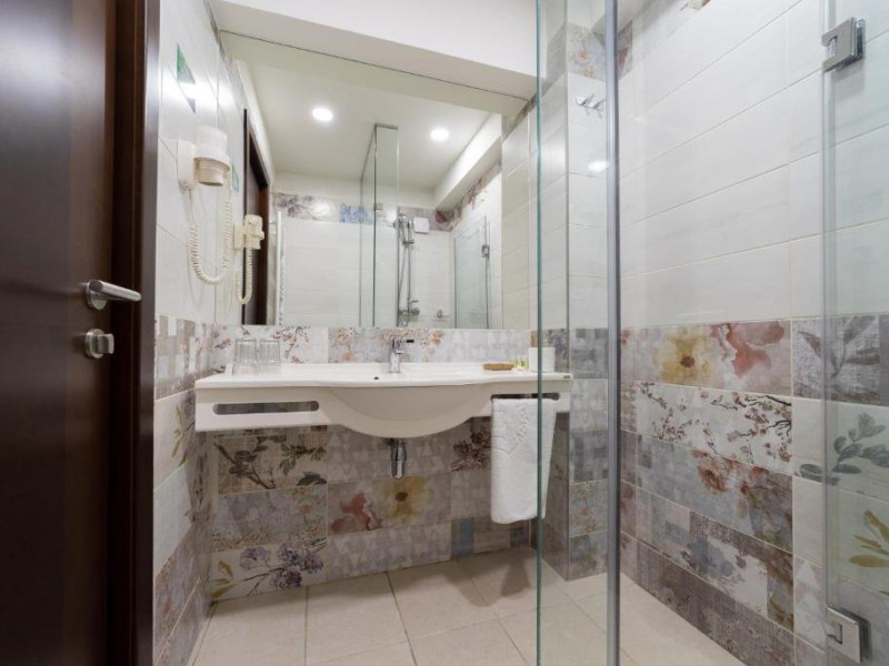 Dotari camera: acces pe baza de cartela, televizor LCD, birou, ferestre panoramice izolate fonic, din podea pana in tavan, baie cu cabina de dus, uscator de par, halat, papuci