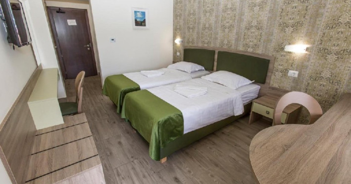 Camera standard twin - cu o suprafata de 16 mp, camera are in componenta doua paturi de 90/200 cm, balcon cu masuta si doua scaune; toti copiii sunt bineveniti, cei pana in 6 ani beneficiaza de gratuitate la cazare daca nu se solicita pat suplimentar; capacitatea maxima pentru paturi suplimentare intr-o camera este de 1.