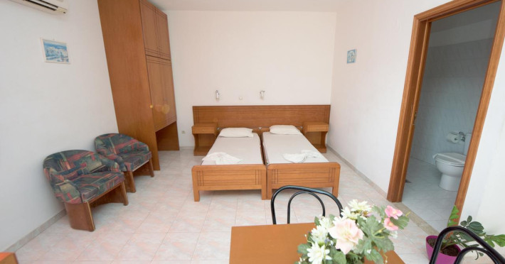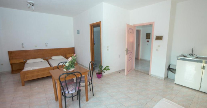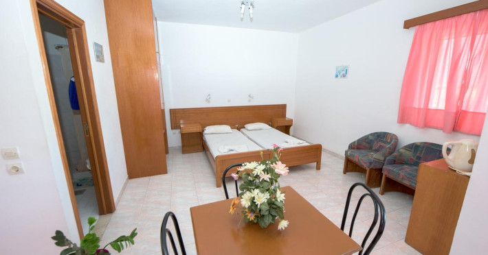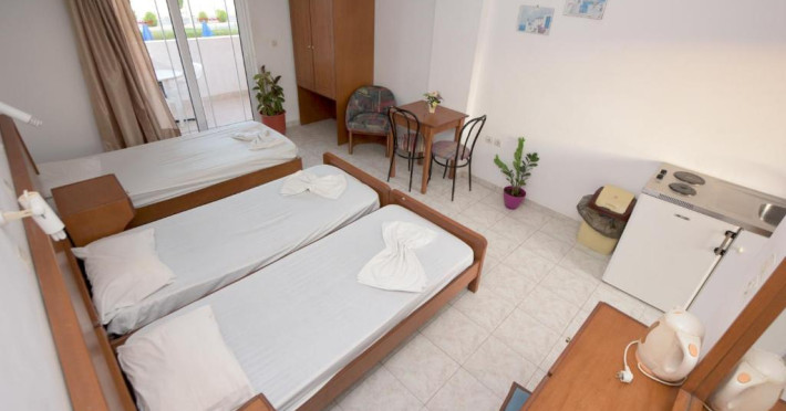 Facilități studiouri: 2 paturi twin, baie privată cu duș, balcon, chicinetă, mini frigider, fierbător de apă, seif (contra cost), dulap, masă, uscător de păr (la cerere) și fier de călcat (la cerere).