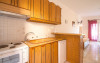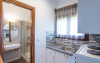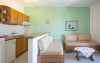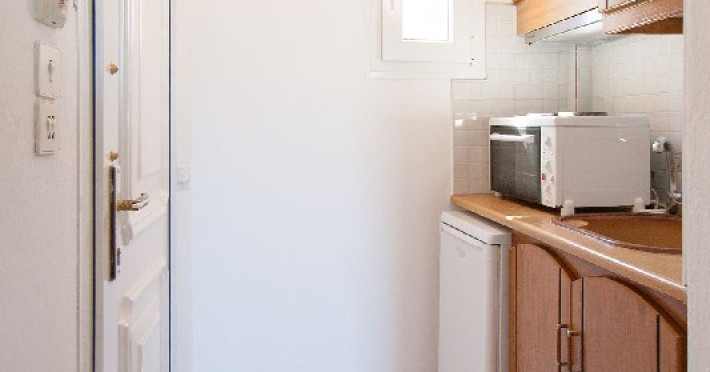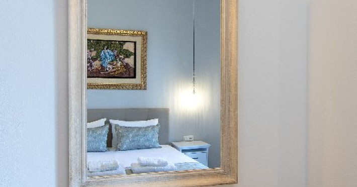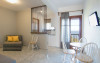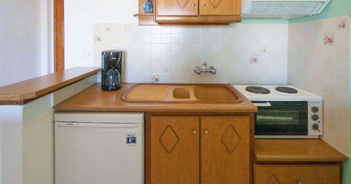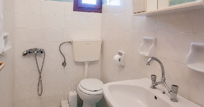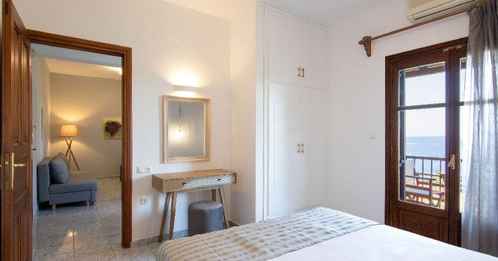 Apartament: La etajul cladirii de la intrare se afla cele 2 apartamente cu vedere directa catre mare, formate dintr-un dormitor si o camera de zi in care este amenajata o chicineta dotata cu cele necesare prepararii si servirii mesei. In camera de zi sunt una sau doua canapele.