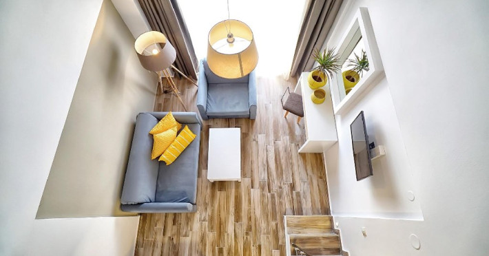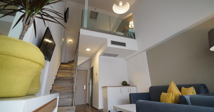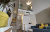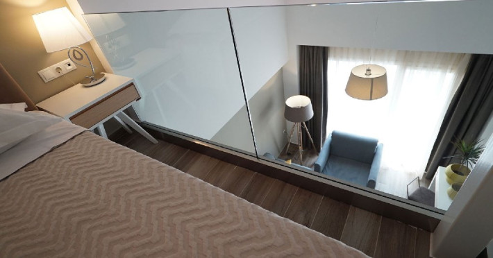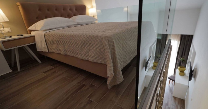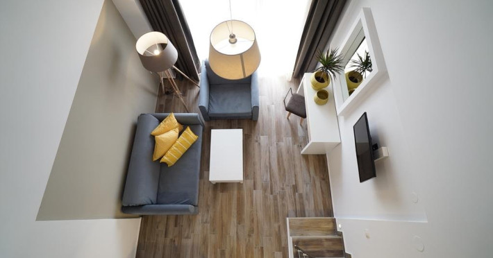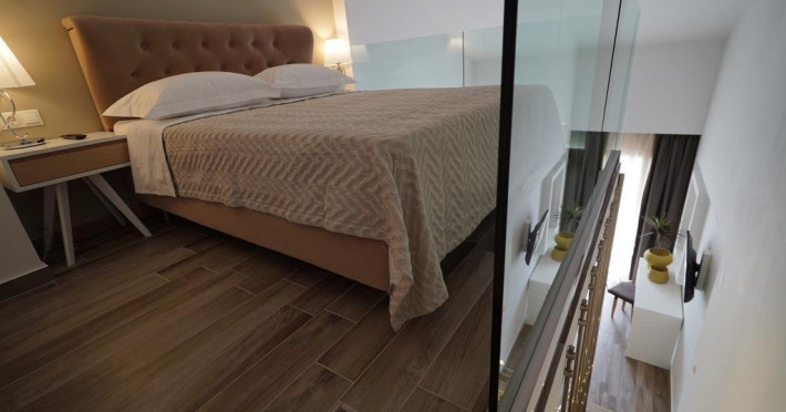 Suite: aprox. 32mp pe 2 nivele si pot caza maximum 5 persoane; un dormitor la nivelul superior iar jos se afla un living cu o canapea dubla si o canapea single; papuci si halat de baie, Nespresso.