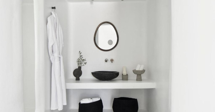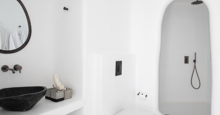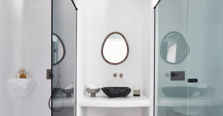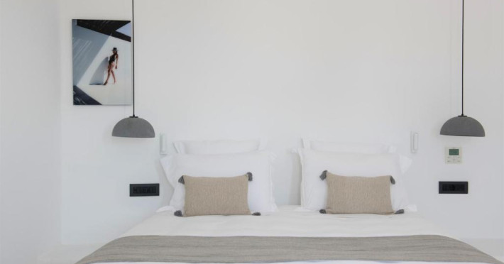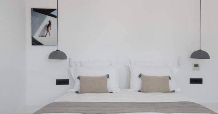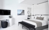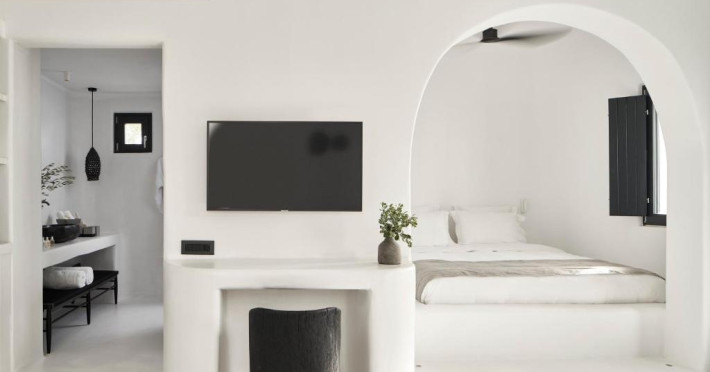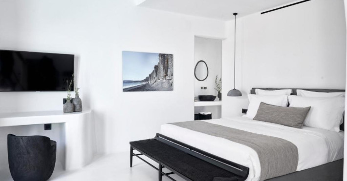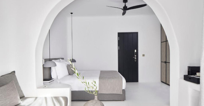 Hotelul imbină perfect designul minimalist specific insulelor grecești cu eleganța și rafinamentul caracteristic brandului Nobu. Camerele și suitele, decorate in nuanțe naturale de alb și gri, dispun de terase private cu vedere la mare, multe dintre ele avand și piscine private cu infinity edge.