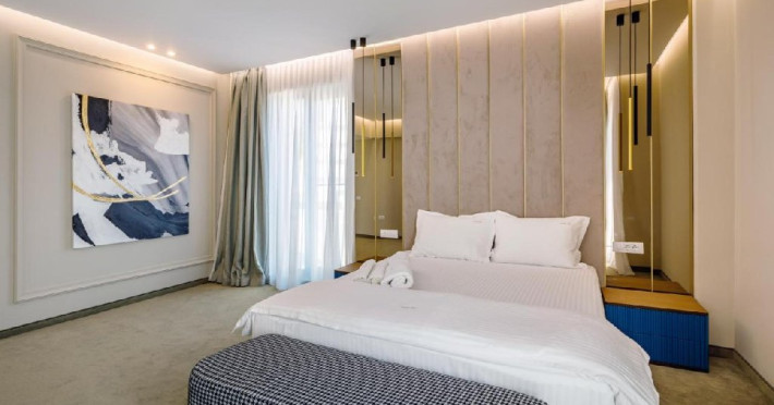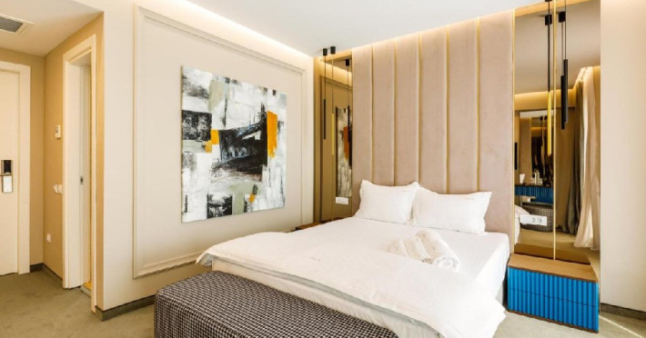 Apartamentul este format din living cu canapea extensibila pentru 2 persoane (copii), terasa, dormitor matrimonial si baie cu cabina de dus, cosmetice hoteliere, halat si uscator de par. Intre cele doua camere exista usa, iar TV se regaseste in ambele camere. Apartamentul dispune de wi fi, minibar, sistem de climatizare, seif, telefon, podele mochetate, plase de tantari. Suprafata 42 mp.
