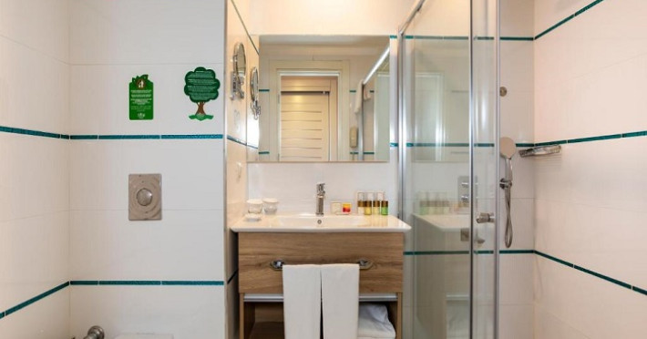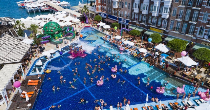 In incinta hotelului exista un restaurant principal, 3 restaurante a la carte, 10 baruri, cafenea, piscina exterioara, piscina interioara, 2 tobogane, cabinet medical (contra cost), coafor, centru spa si welness, spalatorie (contra cost), centru comercial, rent a car. Oaspetii au la dispozitie gratuit sauna, baie turceasca, baie cu aburi, jacuzzi, sala fitness, aerobic, tenis de masa, darts, volei pe plaja, canoe, hidrobicicleta, surfing, internet cafe, club (intrarea este gratuita)..Contra cost: masaj, bowling, biliard, jocuri video, sporturi nautice cu motor. Copiii au la dispozitie piscina, teren de joaca, mini club (4-12 ani), babysitter (contra cost). Plaja este proprie, cu pietris si dispune de un ponton, amenajat in stil oriental, cu perne. Sezlongurile, umbrelele saltelele si prosoapele de plaja sunt gratuite atat la plaja, cat si la piscina.