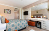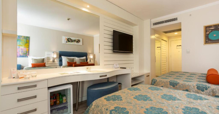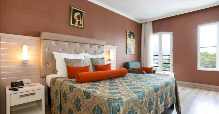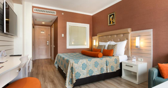Fiecare cameră dispune de un aparat pentru preparare cafea sau ceai, cană-fierbător și minibar. Oaspeții pot solicita serviciul de room service pentru a servi masa sau diverse băuturi. În camere există baie cu cadă sau duș ce are în dotare foehn și articole de toaletă gratuite. Unele camere au balcon cu vedere la mare sau la piscină. Oaspeții au acces gratuit la serviciul Wi-fi în camere. Curățenia in cameră se face zilnic. Toate camerele spațioase de la Orange County Resort Hotel Kemer au zonă de relaxare cu canapea, ceea ce oferă un plus de confort. Proprietatea oferă camere pentru familie cu o suprafață mai mare și un număr mai mare de paturi față de cele standard. Se pot rezerva de asemenea camere pentru nefumători.