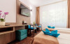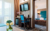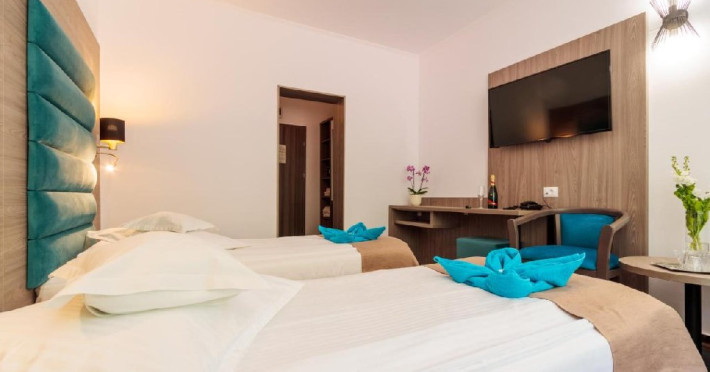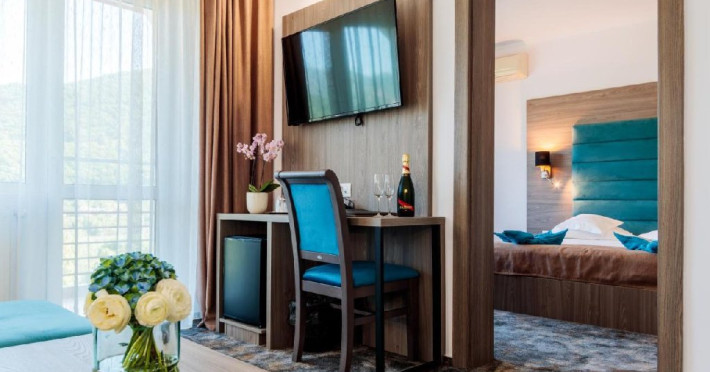 Apartament: acestea sunt destinate pentru 3 adulti sau 2 adulti si 2 copii. Dotari: Tv LED, minibar, linie telefonica internationala, acces internet, acces in camera cu cartele magnetice, bai proprii cu cabina de dus si uscator de par, balcoane cu panorama impresionanta.