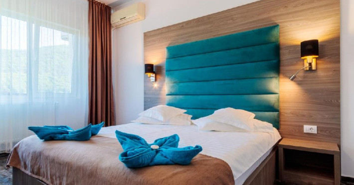 Camera cu pat matrimonial: pentru 2 adulti. Dotari: Tv LED, minibar, linie telefonica internationala, acces internet, acces in camera cu cartele magnetice, bai proprii cu cabina de dus si uscator de par, balcoane cu panorama impresionanta.