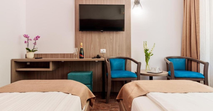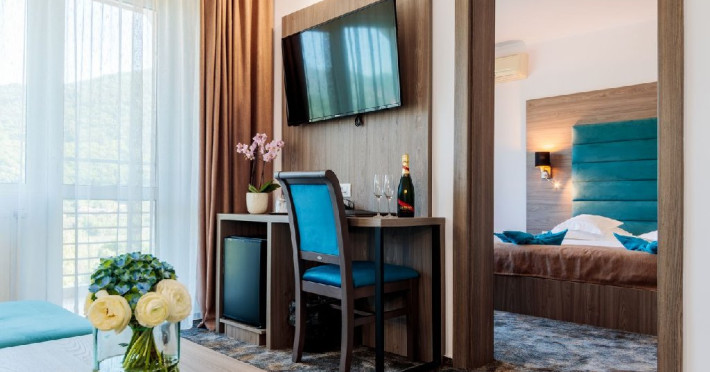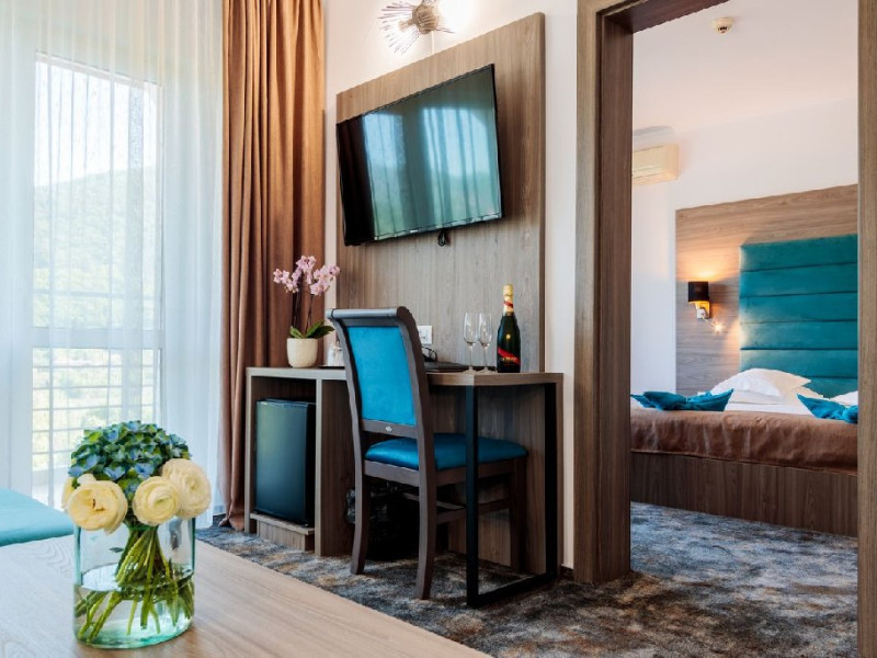 Facilitati:mic dejun bufet suedez, seif, telefon international, plata cu cardul, parcare iluminata, lift, biliard, masa de fotbal, loc de joaca interior pentru copii, servicii de masaj, baza de tratament balnear.
