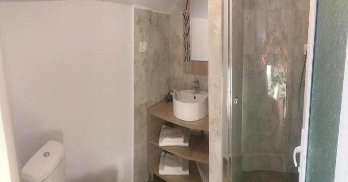 Garsoniere ( etaj) - 1 pat matrimonial ( 1,6/2 metri ) si 1 canapea extensibila (1,8/2 metri) , cu perete despartitor (nu usa).
