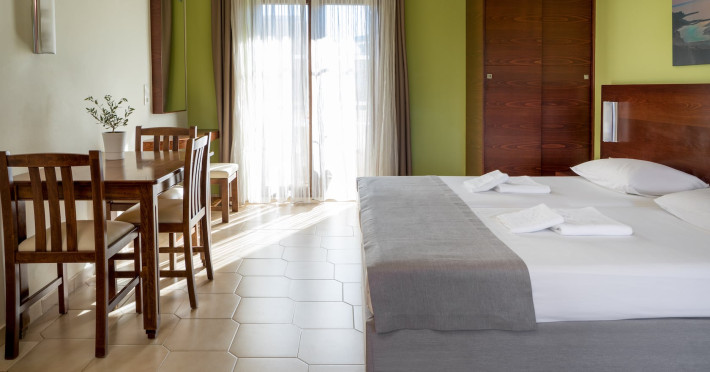 The Hotel offers a great choice of room types to ideally suit the guests needs and make their holiday in Chania, Crete as enjoyable and relaxing as possible. All the Studios & Apartments provide a garden, pool or mountain view, as well as fully equipped kitchenettes, allowing you to live as independently as you wish in self catering holiday style.The hotel's two swimming pools and the two children's pools make it ideal for families. The hotel also features two restaurants, and a up to date gym. The accommodation options studios and apartments offer .The offer studio suites, one bedroom and two bedroom suites, all with a garden or sea view and a fully equipped kitchenette, for an autonomous stay.