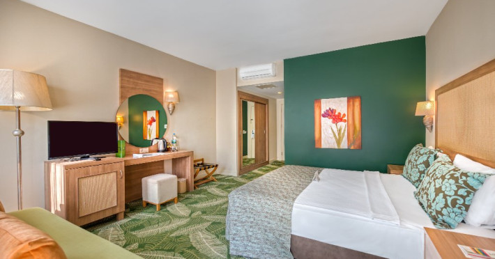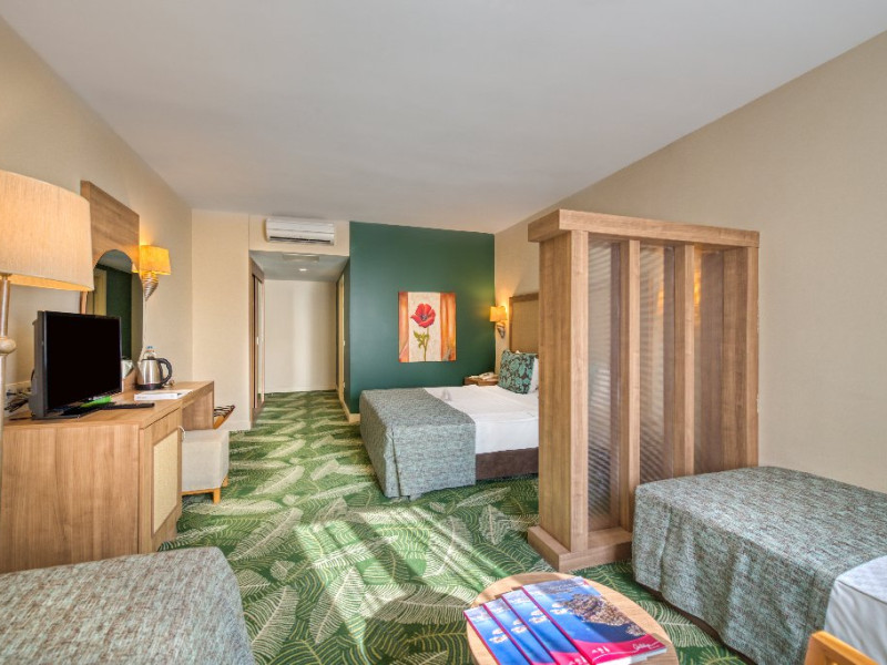 Facilitati hotel: Hotelul ofera oaspetilor sai urmatoarele facilitati: restaurant principal cu meniu special pentru copii, 2 restaurante a la carte cu specific turcesc si italian cu rezervare de 5 euro/pers si un restaurant a la carte cu specific pescaresc cu rezervare de 15 euro/pers. La toate aceste restaurante exista si meniu pentru copii. Alte facilitate incluse in concept sunt: 4 baruri, 2 piscine exterioare pentru adulti, 4 piscine exterioare pentru copii, 1 piscina interioara incalzita cu sectiune pentru copii, piscina cu 3 tobogane, animatie, muzica live, discoteca, mini club, tenis de masa, volei pe plaja, aerobic, darts, centru fitness, baie turceasca, sauna, mini golf, darts, 2 terenuri de tenis cu zgura, scaun special pentru copii in restaurant, camera pentru jocuri, cinema, loc de joaca pentru copii, mini zoo, piscina pentru copii, aquapark, piscina interioara si exterioara, mini disco.