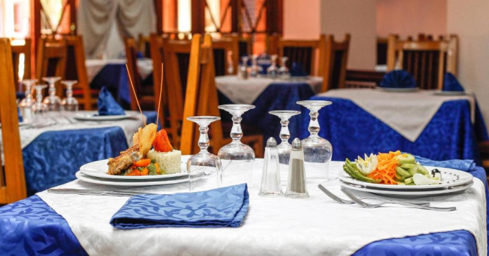 A continental breakfast is served each morning in the dining room. Guests can enjoy other meals on the restaurant’s terrace with a view of the pool, or have a drink or snack in the bar area.