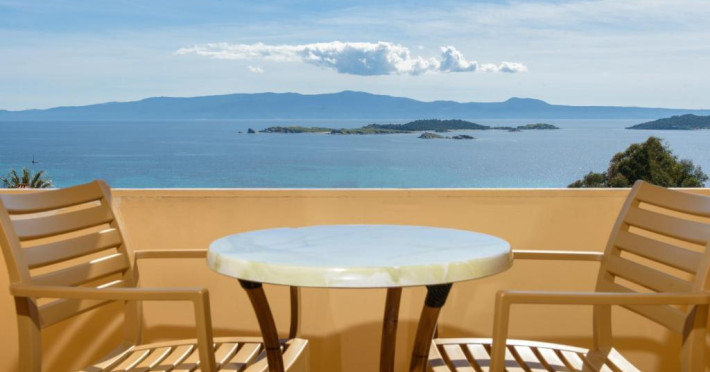 Hotelul este construit pe o colina, la 100 de metri de drumul principal , in Peninsula Athos, la 600 m de centrul orasului Ouranoupoli, la 125 km de aeroportul "Macedonia" Salonic , la 100 m de plaja neamenajata si 200 m de palja amenajata.