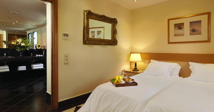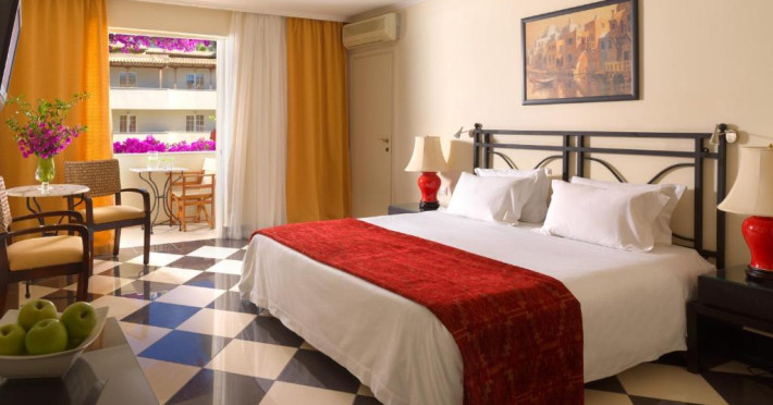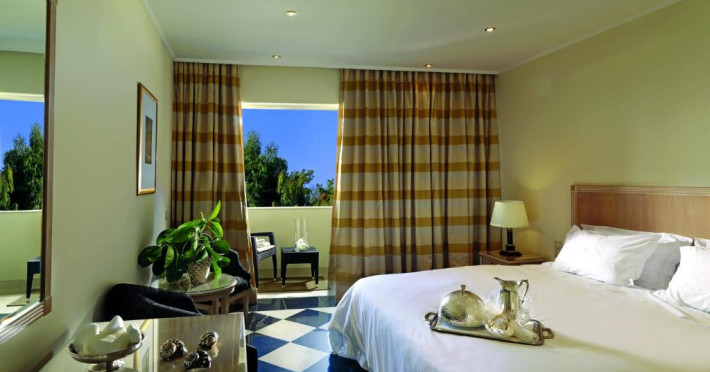 Camerele de la Out Of The Blue, Beach Resort sunt dotate cu aer condiționat, Tv cu canale prin satelit și seif. Fiecare cameră dispune de un aparat pentru preparare cafea sau ceai, cană-fierbător și minibar. Oaspeții pot solicita serviciul de room service pentru a servi masa sau diverse băuturi. Camerele au balcon cu vedere la mare, la piscină sau la grădină. Oaspeții au acces gratuit la serviciul Wi-fi în camere. În camere există baie cu cadă sau duș, foehn, articole de toaletă gratuite, precum și halate de baie și papuci. Curățenia in cameră se face zilnic. Proprietatea oferă camere pentru familie cu o suprafață mai mare și un număr mai mare de paturi față de cele standard.
