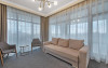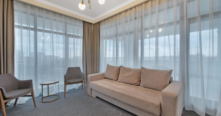 Apartamentul este prevazut cu un dormitor cu pat matrimonial king size, living cu canapea extensibila si fotolii, oglinzi mari cu lupa si leduri, TV, dulapuri push-to-open, telefon, mini-bar, seif de mici dimensiuni, afisaj electronic pentru nu deranjati, va rog faceti curatenie, Wi-Fi gratuit, acces si control prin smart card, aer conditionat cu tehnologia inverter, balcon cu mobilier. Baia include cabina de dus, oglinda cosmetica, halate si papuci, uscator de par, cosmetice Relax|Refresh|Revive. Aproximativ 38 mp.