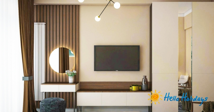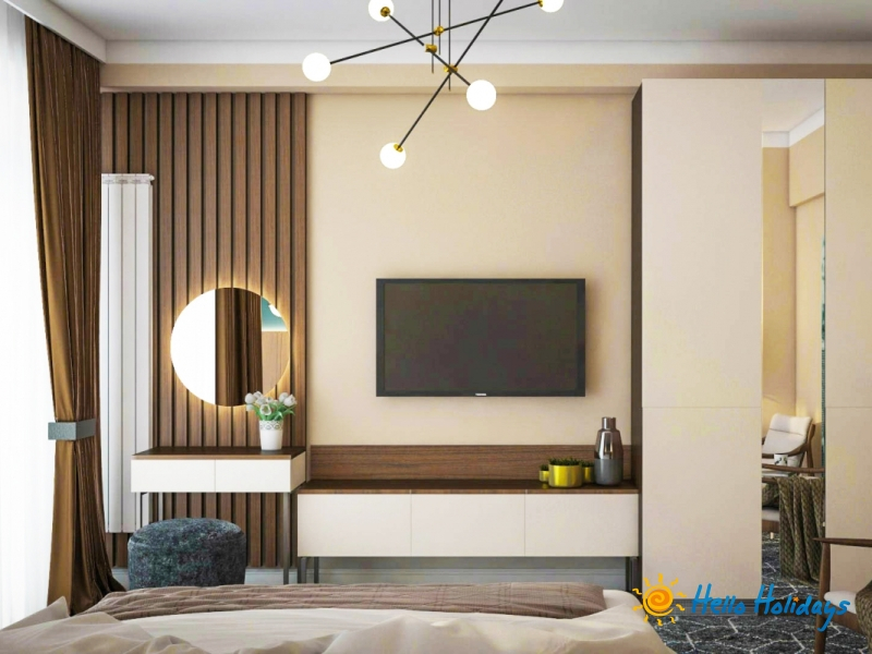 Apartamentul este prevazut cu un dormitor cu pat matrimonial king size, TV Smart Led full HD, linie telefonic Lai living cu canapea extensibila si fotolii, TV Smart Led full HD, seif, aer conditionat, oglinzi mari cu lupa sii leduri, dulapuri push-to-open, mini-bar, seif de mici dimensiuni, afisaj electronic pentru nu deranjati / va rog faceti curatenie, Wi-Fi gratuit, acces si control prin smart card, aer conditionat cu tehnologia inverter si balcon cu mobilier.Baia include cabina de dus, oglinda pentru cosmetica, halate si papuci, usctor de par, cosmetice Relax|Refresh|Revive.