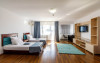 Apartamentul cu un dormitor dispune de living cu canapea/fotolii fixe si un pat single sau doua paturi single, un dormitor separat cu usa, dotat cu pat matrimonial sau 2 paturi twin, baie cu cabina de dus, uscator de par, cosmetice hoteliere si papuci, balcon. Exista LCD tv si aer conditionat in ambele camere. Apartamenul dispune de wi fi, bucatarie utilata. Suprafata 76 mp.