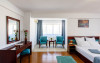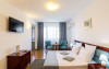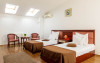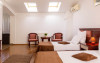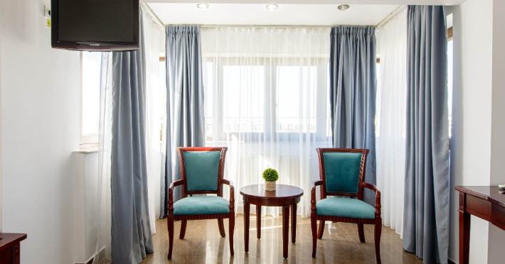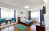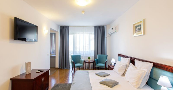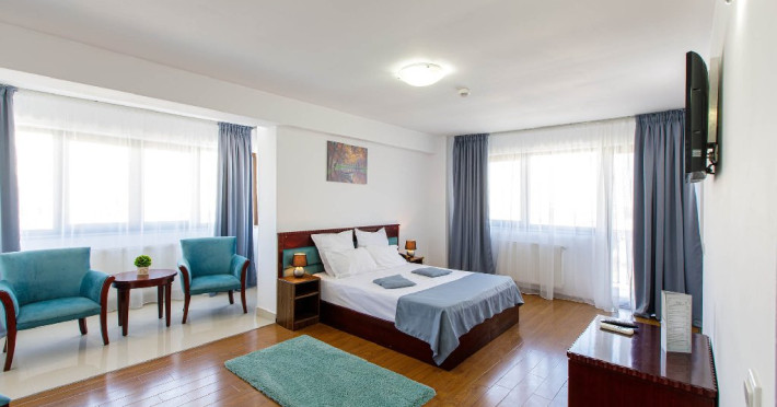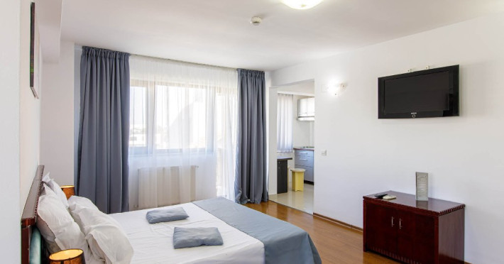 Studio superior dispune de pat matrimonial (160x200), zona cu fotolii si masuta, bucatarie utilata, baie cu cabina de dus, uscator de par, cosmetice hoteliere si papuci, aer conditionat, LCD tv, wi fi, balcon. Suprafata 42 mp.