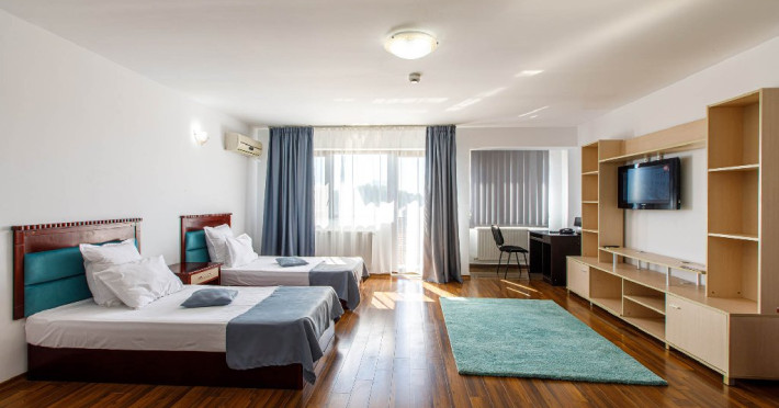 Studio dublu dispune de pat matrimonial (160x200) sau doua paturi twin (90x200), bucatarie utilata, baie cu cada/cabina de dus, uscator de par, cosmetice hoteliere si papuci, aer conditionat, LCD tv, wi fi, balcon. Suprafata 36 mp.