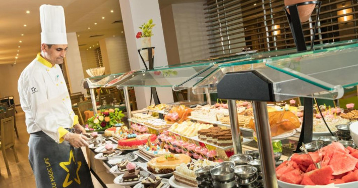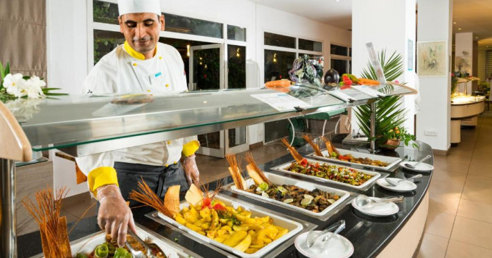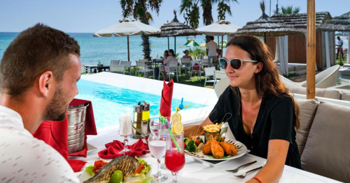 La Palm Beach Club Hammamet oaspeții au la dispoziție un restaurant care servește mâncare în stil bufet. Preparate din bucătăria internațională așteaptă să fie degustate în fiecare zi la micul dejun, prânz și cină. Masa poate fi servită atât în interior, cît si în aer liber, pe terasă, în funcție de vreme. Oaspeţii pot avea diverse băuturi răcoritoare sau alcoolice la bar. În cadrul proprietății există și un snack bar care servește băuturi și gustări.