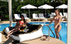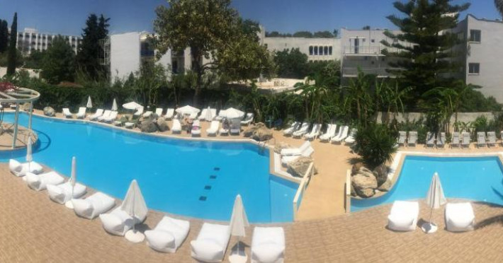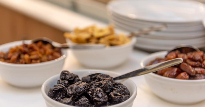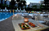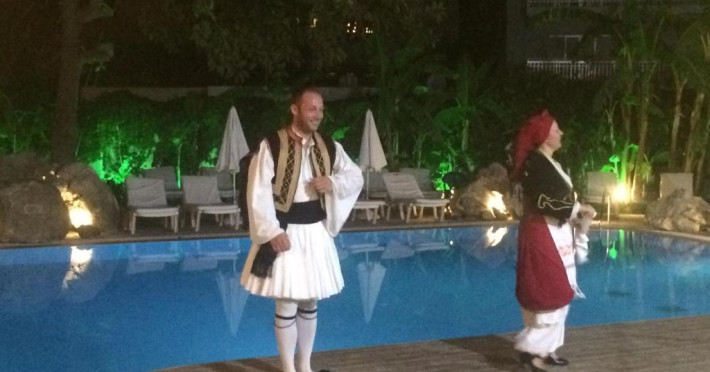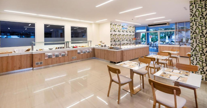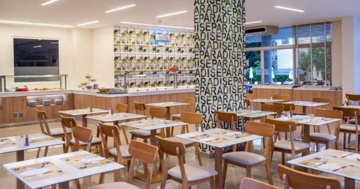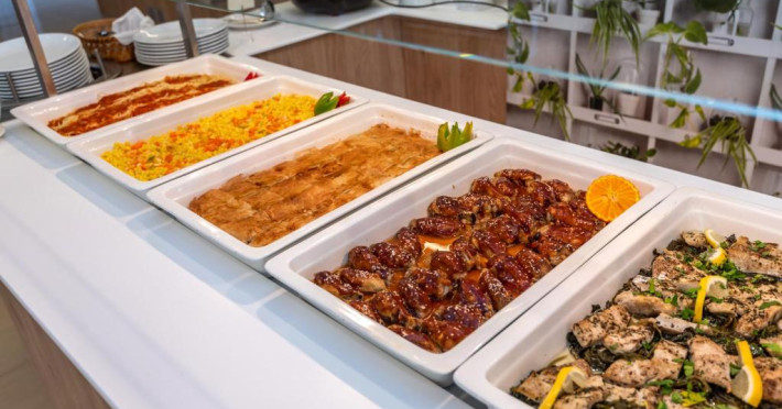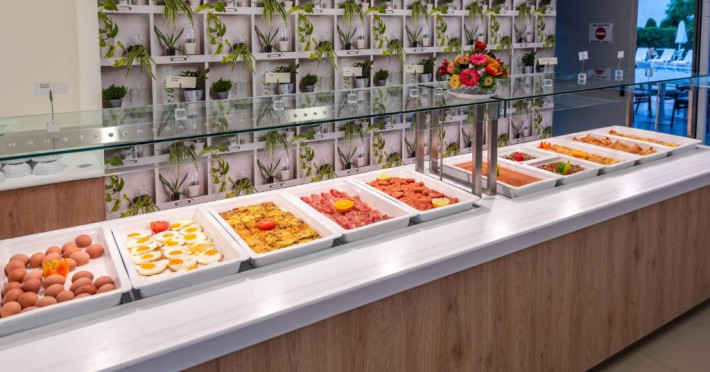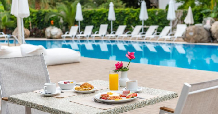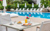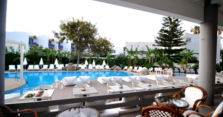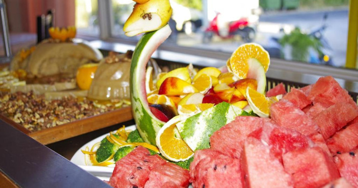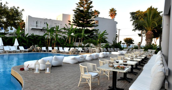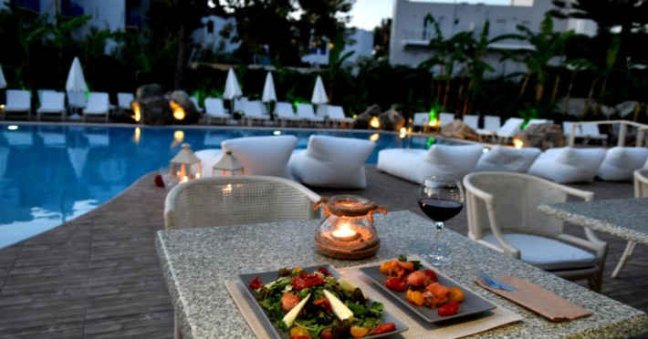 In fiecare dimineață, in sala de mese este servit un mic dejun tip bufet cu fructe proaspete și iaurt grecesc. Oaspeții se pot relaxa la barul de la piscină din grădina cu palmieri, care servește cocktailuri. La cină sunt servite mancăruri mediteraneene și internaționale.