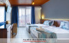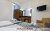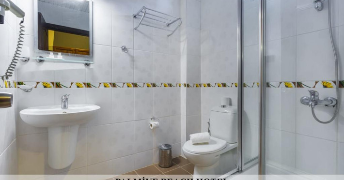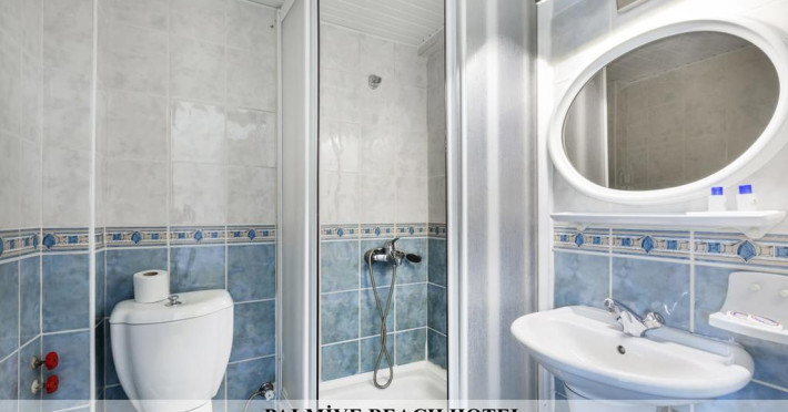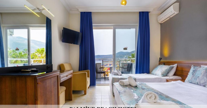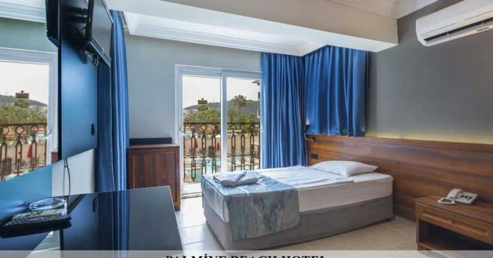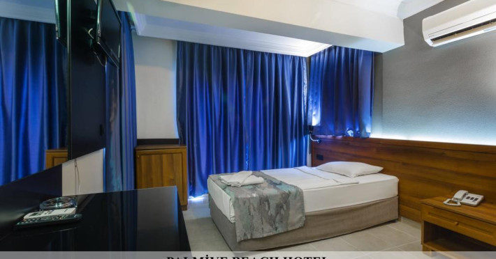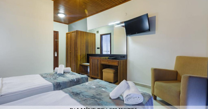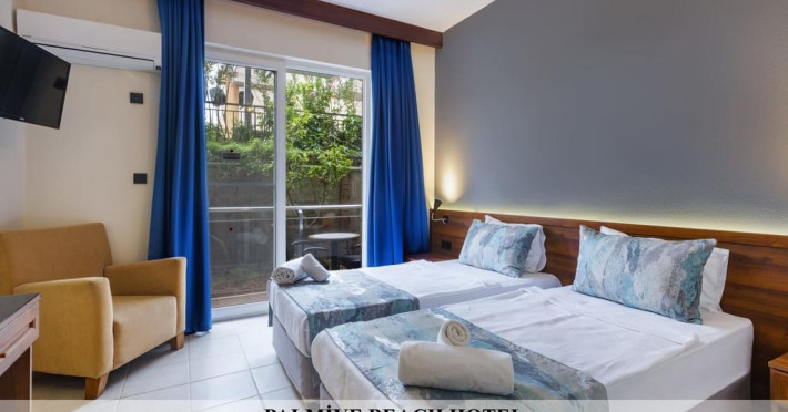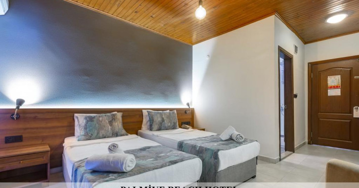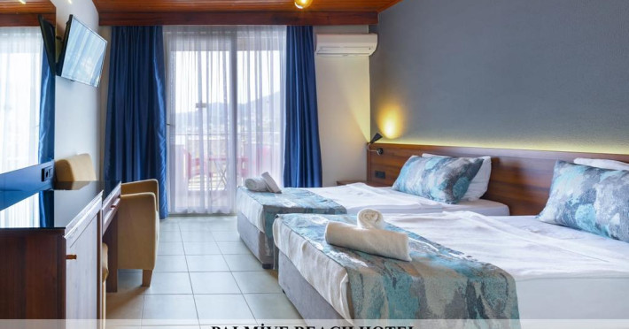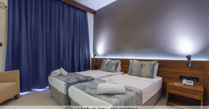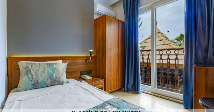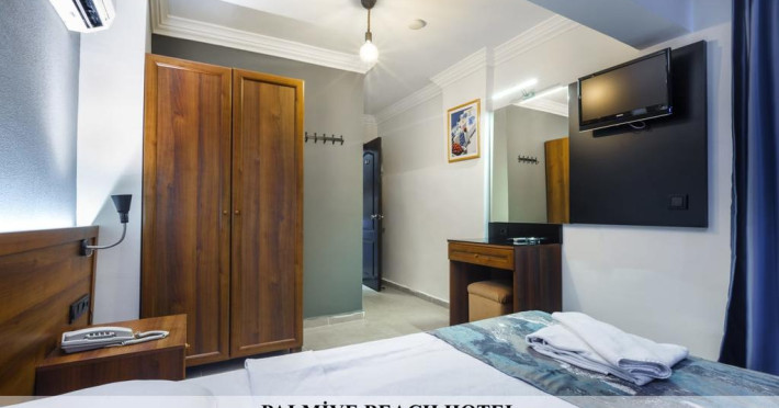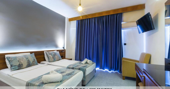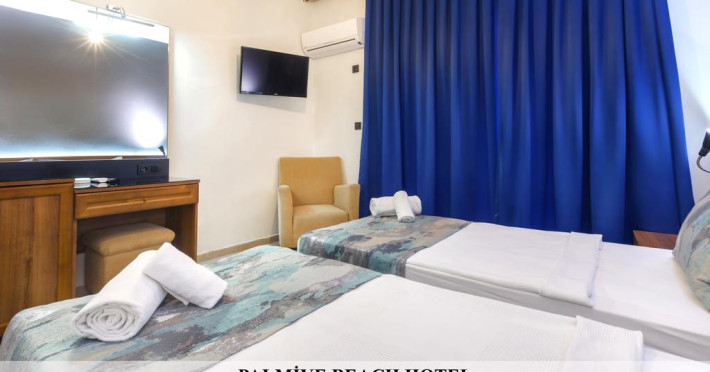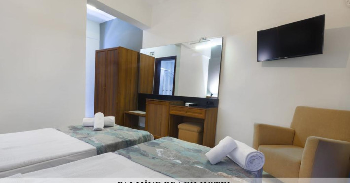 Camerele confortabile de la Palmiye Beach Hotel au pardoseală de gresie/ marmură, aer condiționat, Tv cu canale prin satelit și seif. În camere există baie cu cadă sau duș ce are în dotare foehn și articole de toaletă gratuite. Fiecare cameră dispune de minibar. Oaspeții pot solicita serviciul de room service pentru a servi masa sau diverse băuturi. Unele camere au balcon cu vedere la mare sau la piscină. Curățenia in cameră se face zilnic. Proprietatea oferă camere pentru nefumători.