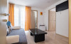 Apartament superior: Apartamentul superior are o superba vedere la mare. Are o suprafata de 50 de metri patrati. Atmosfera calda a camerelor noastre este completata de accesul gratuit la high-speed internet wireless in camera, cat si in toata incinta complexului, TV LCD, instalatie climatizare, minibar.