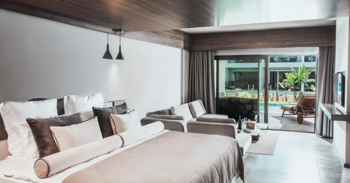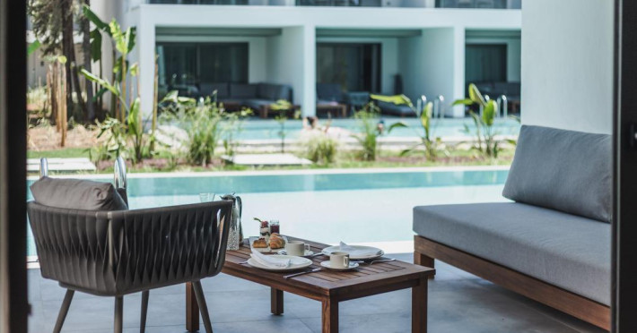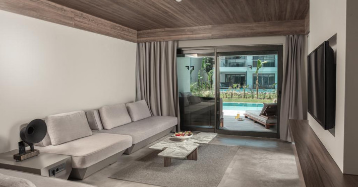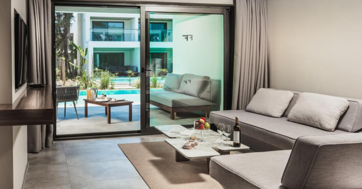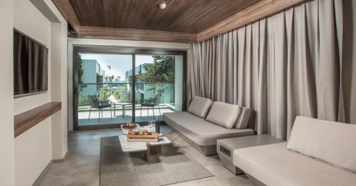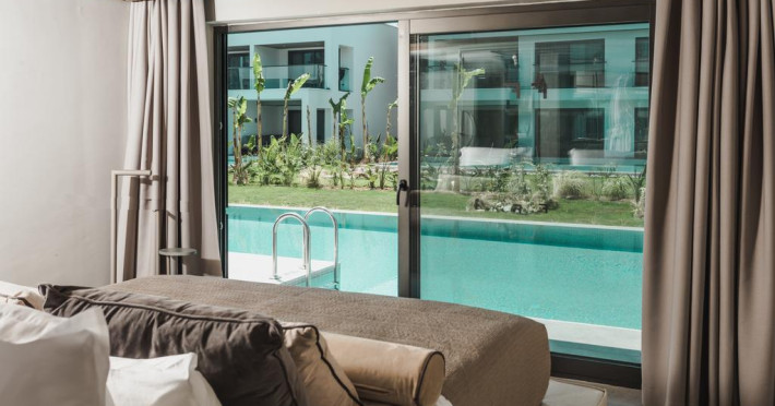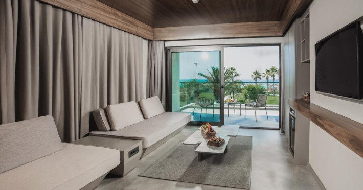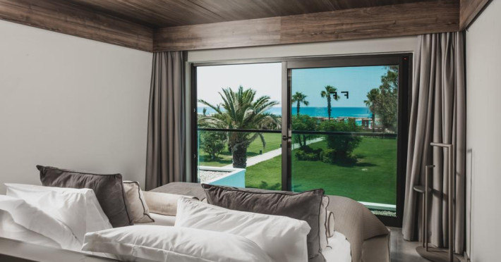 Paloma Finesse Side are în apropiere o plajă cu nisip/pietriș. Pe plajă există șezlonguri și umbrele de plajă.
