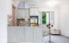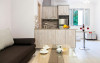 Este un apartament format din: un dormitor cu pat dublu, un open space spatios cu un living cu o canapea dubla extensibila, o zona pentru luat masa si bucatarie complet utilata cu frigider, cana electrica, cuptor, toaster, produse pentru curatenie, vesela etc.