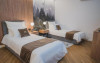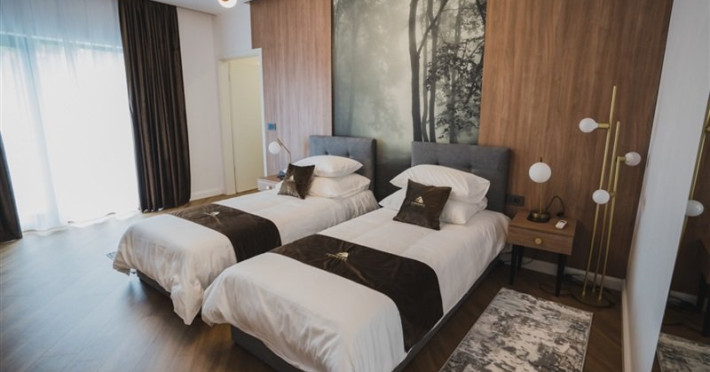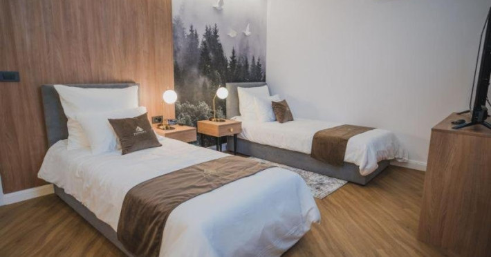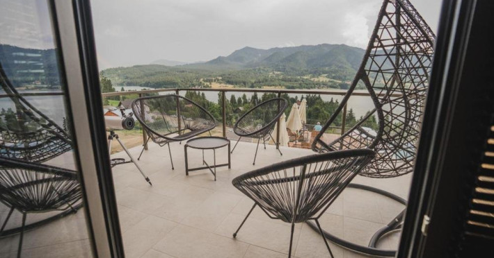 Camera premium: Camera este situata la etajul 3, ofera o panorama spectaculoasa asupra Lacului Colibita, mai ales de pe terasa generoasa. Patul este dublu/twin.