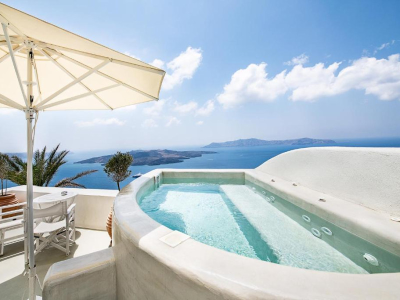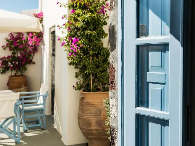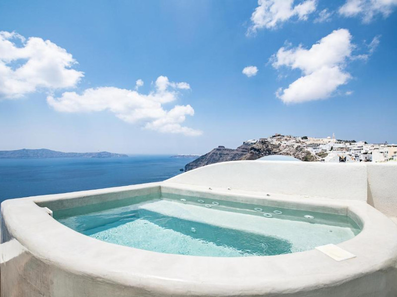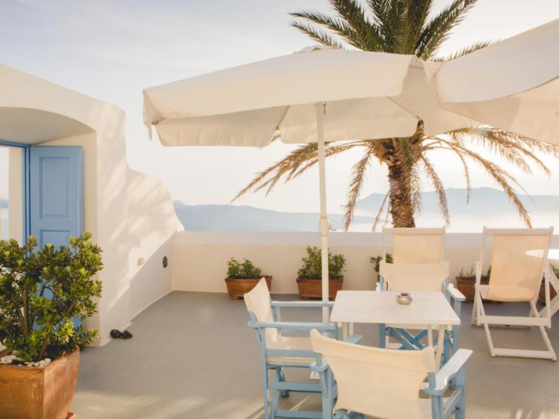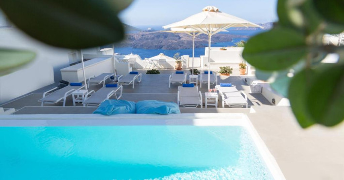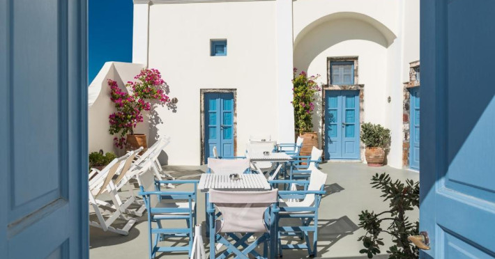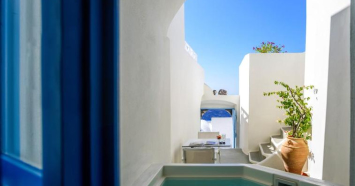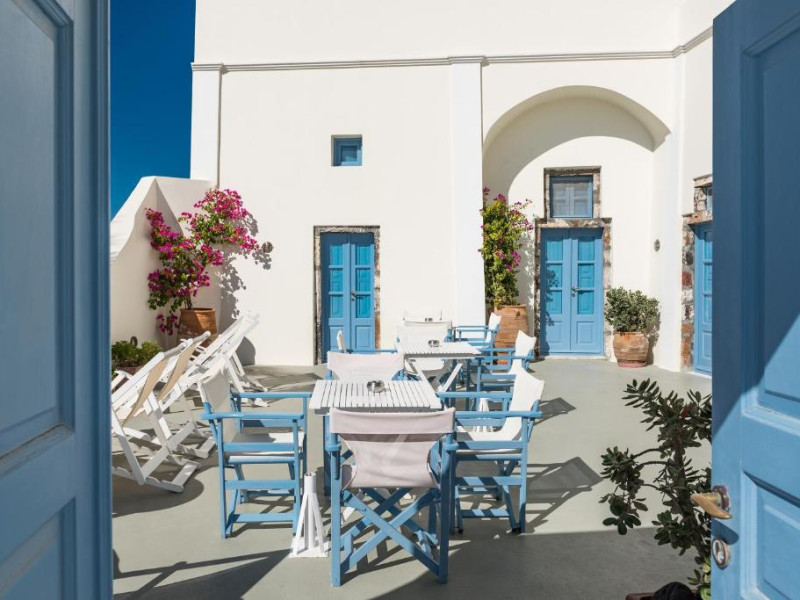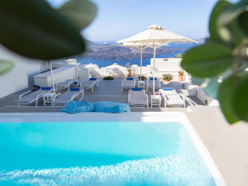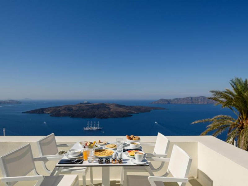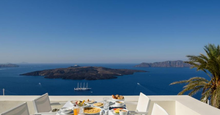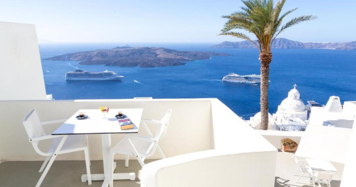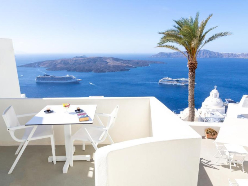 Hotelul este situat in Fira, capitala insulei, pe stancile calderei, cu vedere superbă la vulcan și faimoasele apusuri de soare din Santorini.